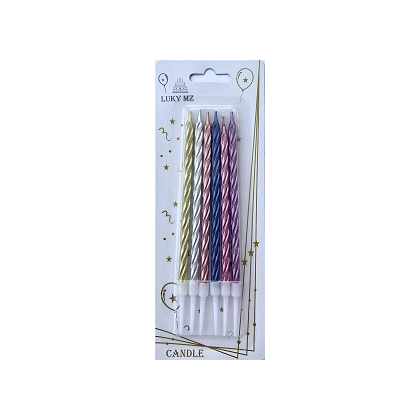 Sviečky metalické špirála vo farbach modrá, zlatá, strieborná , rose gold. Ponúkame široký sortiment sviečok, ozdôb na tortu, ktoré dodajú vašim sladkým výtvorom ten správny šmrnc a urobia z každej oslavy nezabudnuteľný zážitok balenie: 6x sviečka 12 cm so stojanom